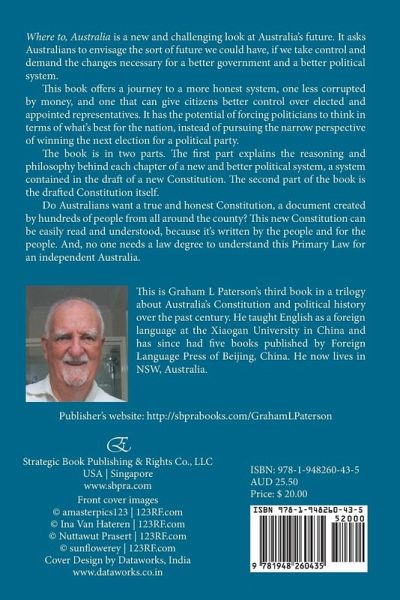 Where to, Australia? is a new and challenging look at Australia's future. It asks Australians to envisage the sort of future we could have, if we take control and demand the changes necessary for a better government and a better political system. This book offers a journey to a more honest system, one less corrupted by money, and one that can give citizens better control over elected and appointed representatives. It has the potential of forcing politicians to think in terms of what's best for the nation, instead of pursuing the narrow perspective of winning the next election for a political party. The book is in two parts. The first part explains the reasoning and philosophy behind each chapter of a new and better political system, a system contained in the draft of a new Constitution. The second part of the book is the drafted Constitution itself. Do Australians want a true and honest Constitution, a document created by hundreds of people from all around the county? This new Constitution can be easily read and understood, because it's written by the people and for the people. And, no one needs a law degree to understand this Primary Law for an independent Australia. This is Graham L Paterson's third book in a trilogy about Australia's Constitution and political history over the past century. He taught English as a foreign language at the Xiaogan University in China and has since had five books published by Foreign Language Press of Beijing, China. He now lives in NSW, Australia.