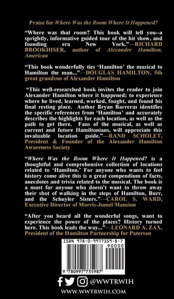 A great companion guide for the new Hamilton movie! Learn all about where Hamilton happened (the man and the musical)! A collection of facts, anecdotes and trivia related to the Broadway show Hamilton: An American Musical and the life of Alexander Hamilton, presented through the locations where it all happened. This guide explains how locations from Hamilton's life are connected to the songs and settings in the musical and provides historical information about each location. With suggested itineraries, maps and subway directions, this guide makes it fun and easy for all fans interested in learning about or seeing the room where it happened. A great gift for any fan of the Broadway show Hamilton or its songs, or anyone interested in Alexander Hamilton or Revolutionary-era history, regardless of whether they ever intend to visit New York. The focus of this book is New York City, Philadelphia and Washington, D.C. and other relevant locations, and for each location in the book, the reader is given which songs occurred at the site, an address, map and subway directions for getting to the site, opening hours (where relevant), a description of which historical figures from the show were ever at the site, and a brief history of the site (with a focus on historical information related to characters from the show). It also includes information on other Alexander Hamilton related locations in the city (that have no relation to the show). For example, the book explains that the song Right Hand Man includes references to events that occurred at each of the Battery, Richmond Hill and Morris-Jumel Mansion, and it includes images of these locations (which may be historical images for sites that no longer exist), a map and subway directions for visiting these sites. In addition, it explains that not only did Richmond Hill serve as George Washington's temporary headquarters (and was the site where Washington first met Aaron Burr), but also that Richmond Hill was the residence of John Adams during his vice-presidency and later was the residence of Aaron Burr, before ultimately being razed and having a portion of the estate become a New York City historical district. The book includes photographs and other images and is indexed (including an index by song title) to make the information easier to use and to make this book a useful reference guide for someone wanting to travel to the sites or wanting to learn more about the history around the events depicted in Hamilton - An American Musical.