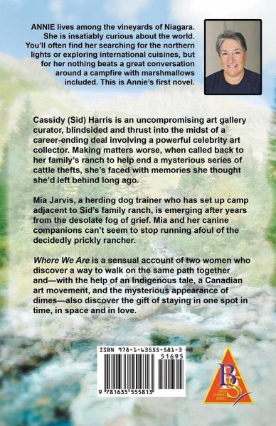 Cassidy (Sid) Harris is an uncompromising art gallery curator, blindsided and thrust into the midst of a career-ending deal involving a powerful celebrity art collector. Making matters worse, when called back to her family's ranch to help end a mysterious series of cattle thefts, she's faced with memories she thought she'd left behind long ago. Mia Jarvis, a herding dog trainer who has set up camp adjacent to Sid's family ranch, is emerging after years from the desolate fog of grief. Mia and her canine companions can't seem to stop running afoul of the decidedly prickly rancher. Where We Are is a sensual account of two women who discover a way to walk on the same path together and—with the help of an Indigenous tale, a Canadian art movement, and the mysterious appearance of dimes—also discover the gift of staying in one spot, in time, in space, and in love.