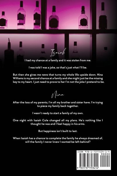 Isaiah I had my chance at a family and it was stolen from me. I was told I was a joke, so that's just what I'll be. But then she gives me news that turns my whole life upside down. ¿Nina Williams is my second chance at a family and she might just be the missing key to my heart. I just need to prove to her I'm not the joke I pretend to be. Nina After the loss of my parents, I'm all my brother and sister have. I'm trying to piece my family back together. I wasn't ready to start a family of my own. One night with Isaiah Cole changed all my plans. He's nothing like I thought he was and I feel happy in his arms. But happiness isn't built to last. When Isaiah has a chance to complete the family he always dreamed of, will the family I never knew I wanted be left behind?