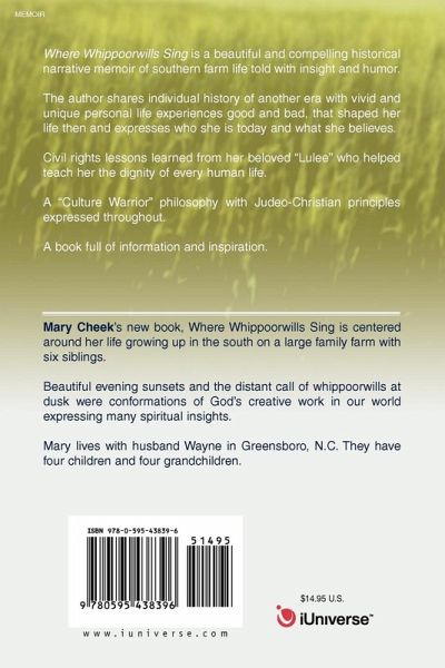 Where Whippoorwills Sing is a beautiful and compelling historical narrative memoir of southern farm life told with insight and humor. The author shares individual history of another era with vivid and unique personal life experiences good and bad, that shaped her life then and expresses who she is today and what she believes. Civil rights lessons learned from her beloved "Lulee" who helped teach her the dignity of every human life. A "Culture Warrior" philosophy with Judeo-Christian principles expressed throughout. A book full of information and inspiration.