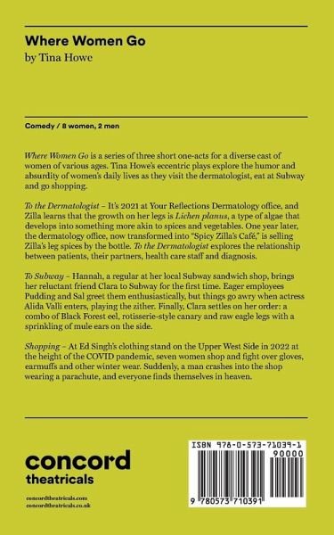 Where Women Go is a series of three short one-acts for a diverse cast of women of various ages. Tina Howe's eccentric plays explore the humor and absurdity of women's daily lives as they visit the dermatologist, eat at Subway and go shopping. To the Dermatologist (7f, 1m voice, Comedy) - It's 2021 at Your Reflections Dermatology office, and Zilla learns that the growth on her legs is lichen planus, a type of algae that develops into something more akin to spices and vegetables. One year later, the dermatology office, now transformed into "Spicy Zilla's Café," is selling Zilla's leg spices by the bottle. To the Dermatologist explores the relationship between patients, their partners, health care staff and diagnosis. To Subway (5f, Comedy) - Hannah, a regular at her local Subway sandwich shop, brings her reluctant friend Clara to Subway for the first time. Eager employees Pudding and Sal greet them enthusiastically, but things go awry when actress Alida Valli enters, playing the zither. Finally, Clara settles on her order: a combo of Black Forest eel, rotisserie-style canary and raw eagle legs with a sprinkling of mule ears on the side. Shopping (8f, 2m, Comedy) - At Ed Singh's clothing stand on the Upper West Side in 2022 at the height of the COVID pandemic, seven women shop and fight over gloves, earmuffs and other winter wear. Suddenly, a man crashes into the shop wearing a parachute, and everyone finds themselves in heaven.