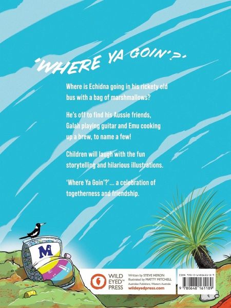 Where is Echidna going in his rickety old bus with a big bag of marshmallows? He's off to find his Aussie friends, Galah playing guitar and Emu cooking up a brew, to name a few! Children will laugh with the fun storytelling and hilarious illustrations. 'Where Ya Goinn'?' ... a celebration of togetherness and friendship. Wild Eyed Press totally supports the concept paying royalties for the use of manuscripts and artworks. Wild Eyed Press sees this as both a moral and intellectual obligation. When you read this book, you can do so with the knowledge that it was fully created by real people for real people. Creators affiliated with Wild Eyed Press sign contracts to say they do not use Artificial intelligence when illustrating or writing children's books for your child. Written and illustrated by real people for real children. Our creators care about literacy and child welfare. They support you, please support them.