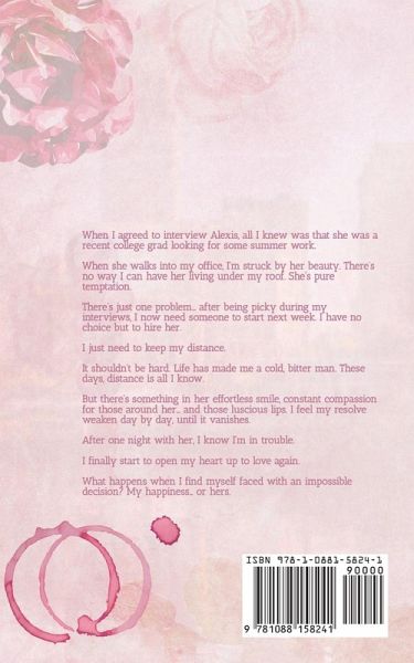 When I agreed to interview Alexis, all I knew was that she was a recent college grad looking for some summer work. When she walks into my office, I'm struck by her beauty. There's no way I can have her living under my roof. She's pure temptation. There's just one problem... after being picky during my interviews, I now need someone to start next week. I have no choice but to hire her. I just need to keep my distance. It shouldn't be hard. Life has made me a cold, bitter man. These days, distance is all I know. But there's something in her effortless smile, constant compassion for those around her... and those luscious lips. I feel my resolve weaken day by day, until it vanishes. After one night with her, I know I'm in trouble. I finally start to open my heart up to love again. What happens when I find myself faced with an impossible decision? My happiness... or hers.