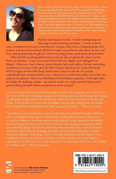 Jill McDonough's frank, funny, and tender second book offers each day fresh with the gift of it. Fierce/nose-sting of tears, quick breath out of nowhere. In love-poems, conversations, intimate jokes, from a hundred parties, five prisons, and three beloved bars, McDonough helps you better see "Where You Live".