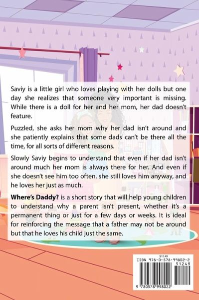 Saviy is a little girl who loves playing with her dolls, but she realizes that someone very important is missing one day. While there is a doll for her and her mom, her dad doesn't feature. Puzzled, she asks her mom why her dad isn't around and she patiently explains that some dads can't be there all the time, for all sorts of different reasons. Slowly Saviy begins to understand that even if her dad isn't around much her mom is always there for her. And even if she doesn't see him too often, she still loves him anyway, and he loves her just as much. Where's Daddy? is a short story that will help young children to understand why a parent isn't present, whether it's a permanent thing or just for a few days or weeks. It is ideal for reinforcing the message that a father may not be around but that he loves his child just the same.