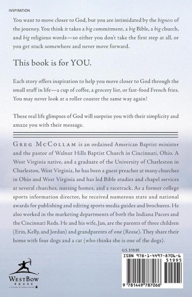 You want to move closer to God, but you are intimidated by the bigness of the journey. You think it takes a big commitment, a big Bible, a big church, and big religious words-so either you don't take the first step at all, or you get stuck somewhere and never move forward. This book is for you. Each story offers inspiration to help you move closer to God through the small stuff in life-a cup of coffee, a grocery list, or fast-food French fries. You may never look at a roller coaster the same way again! These real life glimpses of God will surprise you with their simplicity and amaze you with their message.