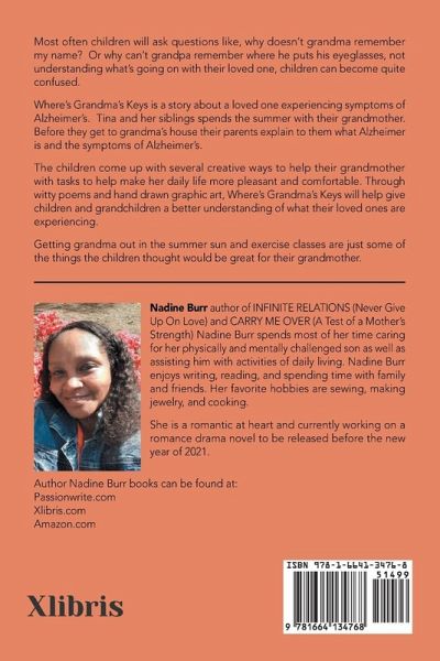 Most often children will ask question like, why doesn't grandma remember my name? Or why can't grandpa remember where he puts his eyeglasses, not understanding what's going on with their loved one, children can become quite confused. Where's Grandma's Keys is a story about a loved one experiencing symptoms of Alzheimer's. Tina and her sibling spend the summer with their grandmother. Before they get to grandma's house their parent explains to them what Alzheimer is and the symptoms of Alzheimer's. The children come up with several creative ways to help their grandmother with tasks to help make her daily life more pleasant and comfortable. Through witty poems and hand drawn graphic art, Where's Grandma's Keys will help gives children and grandchildren a better understanding of what their loved ones are experiencing. Getting grandma out in the summer sun and exercise classes are just some of the things the children thought would be great for their grandmother.