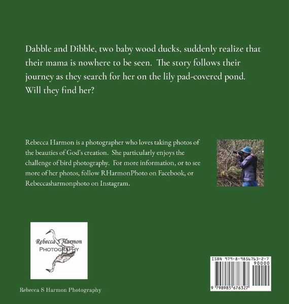 Dabble and Dibble, two baby wood ducks, suddenly realize that their mama is nowhere to be seen. The story follows their journey as they search for her on the lily pad-covered pond. The book has 35 full page photo illustrations of the ducklings as they wander around the wetlands. Will they find her?