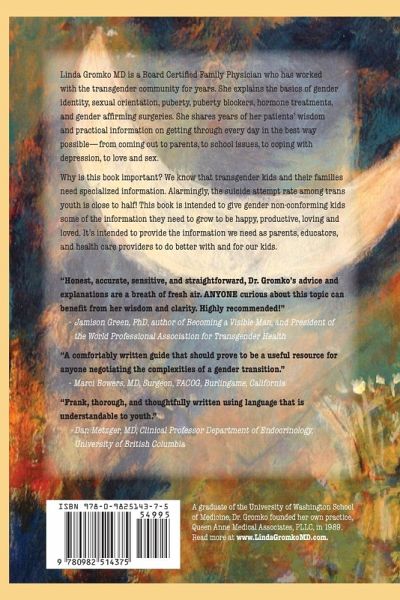 Linda Gromko MD is a board-certified family physician who has worked with the transgender community for years. She explains the basics of gender identity, sexual orientation, puberty, puberty blockers, hormone treatments, and gender-affirming surgeries. She shares years of her patients' wisdom and practical information on getting through every day in the best way possible-from coming out to parents, to school issues, to coping with depression, to love and sex. Why is this book important? We know that transgender kids and their families need specialized information. Alarmingly, the suicide attempt rate among trans youth is close to half! This book is intended to give gender non-conforming kids some of the information they need to grow to be happy, productive, loving, and loved. It's intended to provide the information we need as parents, educators, and healthcare providers to do better with and for our kids.