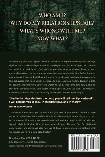 Where's My Husband? is an autobiography and self-help piece in one: a journey of endless attempts to find love and acceptance, the spouse of your dreams, and a life lived "happily ever after!" Corbett sheds light on the childhood messages and missing love and affirmation of her father as the story unfolds with one broken relationship after another. As the creative desperation of the author's mind and will are exposed to the reader, one will find themselves relating to her and even locking arms with her relentless and unending grief. The death of multiple marriages and despair of bad choices come to a screeching halt as she faces the havoc wrought primarily by the woman in the mirror, where her suffering brings her to the brink of a mental breakdown. Where's My Husband? confronts a global identity crisis and shows you how to erase guilt, shame, and rejection through real-life scenarios and solutions. Corbett reveals areas of manipulation, co-dependency, and destructive behaviors to recognize and reverse otherwise irreparable emotional and mental damage. Learn how to fight for your life and not settle for the power of a harmful past. Walk in the power of your own will and in support of the truth given by God. You do not have to let your past, people, or circumstances destroy your hopes and dreams. This book will guide you on a journey of healing, renewed hope, and realization of your true value and worth in God's eyes. The end of the story will give you hope to find the True Love of every craving heart!