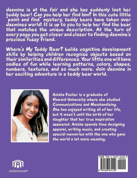 Jasmine is at the fair and she has suddenly lost her teddy bear! Can you help her find him? In this cute little "point and find" mystery, teddy bears have taken over Jasmines world! It is up to you to help her find the bear that matches the unique description. At the turn of every page you get closer and closer to finding Jasmine's precious fuzzy friend. Where's My Teddy Bear builds cognitive development skills by helping children recognize objects based on their similarities and differences. Your little one will have oodles of fun while learning patterns, colors, shapes, numbers, textures, and so much more. Join Jasmine in her exciting adventure in a teddy bear world.