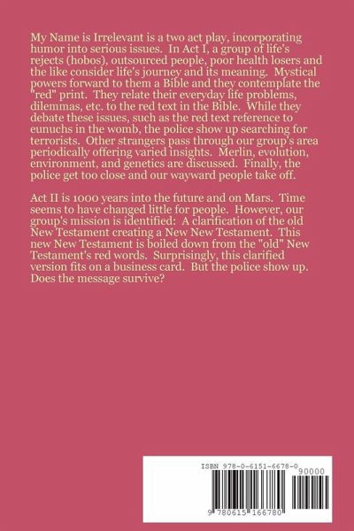 Where's Sancho?III is the third in a series of contemporary plays. In Act I, a group of life's rejects (hobos), outsourced people, and poor health losers consider life's journey and its meaning. Mystical powers send them a Bible and they contemplate the "red" print. They relate their everyday life problems, dilemmas, etc. to the red text in the Bible. While they debate issues such as the red text reference to eunuchs in the womb, the police show up searching for terrorists. Merlin, evolution, environment, and genetics are discussed. Finally, the police get too close and our wayward people take off. Act II is 1000 years into the future and on Mars. Time seems to have changed little for people. However, our group's mission is identified. A clarification of the old New Testament creating a new New Testament. Surprisely this clarified version fits on a business card. But the police show up. Does the message survive?