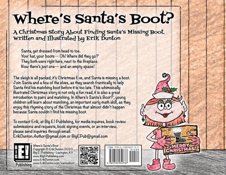 Where's Santa's Boot? is the latest children's picture book from Erik Dunton (www.erikdunton.com) and Big E! Publishing (www.bigepublishing.com). The sleigh is all packed, it's Christmas Eve, and Santa is missing a boot. Join Santa and a few of the elves, as they search frantically to help Santa find his matching boot before it is too late. This whimsically illustrated Christmas story is not only a fun read, it is also a great introduction to pairs and matching. In Where's Santa's Boot?, young children will learn about matching, an important early math skill, as they enjoy this rhyming story of the Christmas that almost didn't happen because Santa couldn't find his missing boot. To contact Erik, at Big E! Publishing, for media inquires, book review submissions and requests, book signing events, or an interview, please send inquiries through email: ErikDunton.Author@gmail.com or BigEPub@gmail.com