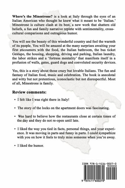 Minestrone is a chance to see Italy for the first time through the eyes of an Italian American who thought he knew what it meant to be 'Italian.' You will see the beauty of this wonderful country and feel the warmth of its people. But you also will be amazed and even shocked by the many surprises awaiting your first encounters with the food, the Italian bathroom, the bus ticket Gestapo, the housing, shopping, driving and parking, Italian laundry, the labor strikes and a 'fortress mentality' that manifests itself in a profusion of walls, gates, guard dogs and convoluted security devices. Do you know how hard it is to find minestrone soup in Italy? Or pepperoni pizza? Did you know that Italian American food is actually more authentic than Italian food? It's true! Where's the Minestrone is a fun and family narrative replete with sentimentality, cross-cultural comparisons and outrageous humor.