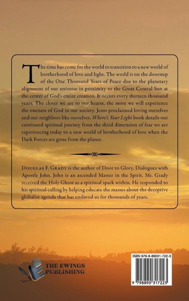 The time has come for the world to transition to a new world of brotherhood of love and light. The world is on the doorstep of the One Thousand Years of Peace due to the planetary alignment of our universe in proximity to the Great Central Sun at the center of God's entire creation. It occurs every thirteen thousand years. The closer we are to our hearts, the more we will experience the oneness of God in our society. Jesus proclaimed loving ourselves and our neighbors like ourselves. Where's Your Light book details our continued spiritual journey from the third dimension of fear we are experiencing today to a new world of brotherhood of love when the Dark Forces are gone from the planet.