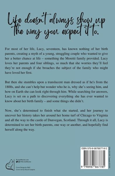 Life doesn't always show up the way you expect it to. For most of her life, Lucy, seventeen, has known nothing of her birth parents, creating a myth of a young, struggling couple who wanted to give her a better chance at life - something the Moretti family provided. Lucy loves her parents and four siblings, so much that she worries they'll feel they're not enough if she broaches the subject of the family who might have loved her first. But then she stumbles upon a translucent man dressed as if he's from the 1800s, and she can't help but wonder who he is, why she's seeing him, and how on Earth she can look right through him. While searching for answers, Lucy is set on a path to discovering everything she has ever wanted to know about her birth family - and some things she didn't. Now, she's determined to finish what she started, and her journey to uncover her history takes her around her home turf of Chicago to Virginia and all the way to the castle of Dunvegan, Scotland. Through it all, Lucy is determined to see her birth parents, one way or another, and hopefully find herself along the way.