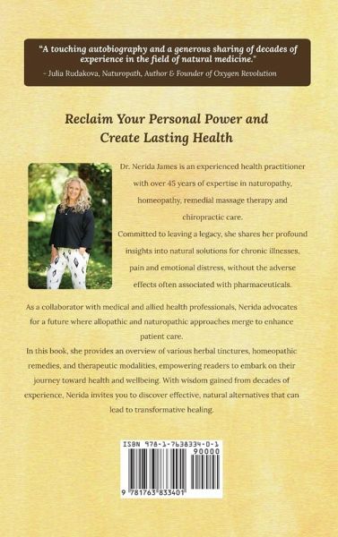 Dr Nerida James is an experienced health practitioner with over 45 years of expertise in naturopathy, homeopathy, remedial massage therapy and chiropractic care. Committed to leaving a legacy, she shares her profound insights into natural solutions for chronic illnesses, pain and emotional distress, without the adverse effects often associated with pharmaceuticals. As a collaborator with medical and allied health professionals, Nerida advocates for a future where allopathic and naturopathic approaches merge to enhance patient care. In this book, she provides an overview of various herbal tinctures, homeopathic remedies, and therapeutic modalities, empowering readers to embark on their journey toward health and wellbeing. With wisdom gained from decades of experience, Nerida invites you to discover effective, natural alternatives that can lead to transformative healing.