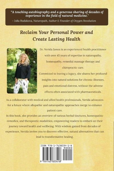 Dr Nerida James is an experienced health practitioner with over 45 years of expertise in naturopathy, homeopathy, remedial massage therapy and chiropractic care. Committed to leaving a legacy, she shares her profound insights into natural solutions for chronic illnesses, pain and emotional distress, without the adverse effects often associated with pharmaceuticals. As a collaborator with medical and allied health professionals, Nerida advocates for a future where allopathic and naturopathic approaches merge to enhance patient care. In this book, she provides an overview of various herbal tinctures, homeopathic remedies, and therapeutic modalities, empowering readers to embark on their journey toward health and wellbeing. With wisdom gained from decades of experience, Nerida invites you to discover effective, natural alternatives that can lead to transformative healing.