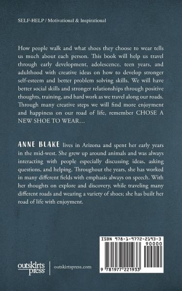 How people walk and what shoes they choose to wear tells us much about each person. This book will help us travel through early development, adolescence, teen years, and adulthood with creative ideas on how to develop stronger self-esteem and better problem solving skills. We will have better social skills and stronger relationships through positive thoughts, training, and hard work as we travel along our roads. Through many creative steps we will find more enjoyment and happiness on our road of life, remember CHOSE A NEW SHOE TO WEAR...