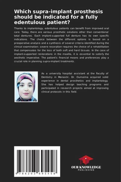 Thanks to implantology, edentulous patients can benefit from improved oral care. Today, there are various prosthetic solutions other than conventional total dentures. Each implant-supported full denture has its own specific indications. The choice between the different options is based on a preoperative analysis and a synthesis of several criteria identified during the clinical examination: severe resorption requires the choice of a rehabilitation that compensates for the loss of both soft and hard tissues. In the case of implant-supported restorations in the maxilla, it is essential to satisfy the aesthetic imperative. The patient's financial means and preferences play a crucial role in planning supra-implant treatments.