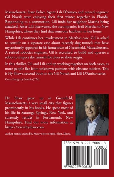 Massachusetts State Police Agent Lili D'Amico and retired engineer Gil Novak were enjoying the last couple of weeks of their first winter together in Florida. With a little mahjong and a little fishing, they were having fun, making new friends, and getting used to living with each other. Responding to a commotion, Lili finds her neighbor Martha being strangled and near death. Lili confronts the attacker and ends up having to dispatch him. Lili accompanies frail Martha to her home in New Hampshire, where another assassination attempt occurs. While Lili continues her involvement in Martha's case, Gil is asked to consult on a separate case about recently dug tunnels that have mysteriously appeared in his hometown of Greenfield, Massachusetts. A retired robotics engineer, Gil is recruited to build and operate a robot to inspect the tunnels for clues to their origin. In this thriller, Gil and Lili end up working together on both cases, as more people are pursued by unknown pursuers with obscure motives. There is a lot going on in this book, with aspects tying to infamous events in Native American and global history. This is Hy Shaw's second book in the Gil Novak and Lili D'Amico series.