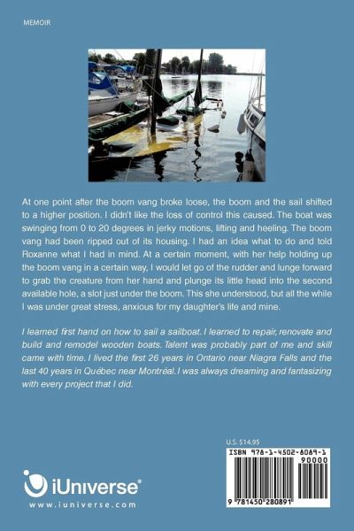 At one point after the boom vang broke loose, the boom and the sail shifted to a higher position. I didn't like the loss of control this caused. The boat was swinging from 0 to 20 degrees in jerky motions, lifting and heeling. The boom vang had been ripped out of its housing. I had an idea what to do and told Roxanne what I had in mind. At a certain moment, with her help holding up the boom vang in a certain way, I would let go of the rudder and lunge forward to grab the creature from her hand and plunge its little head into the second available hole, a slot just under the boom. This she understood, but all the while I was under great stress, anxious for my daughter's life and mine. The wind was quite strong and I didn't want the boat to flip over ... not there, away from any available help. We were two miles from shore in any direction. I checked the waves and wind and then turned the boat into the wind. On my signal to Roxanne, I lurched forward and grabbed the beastly creature and shakily shoved its head in the hole. I then turned the boat back to windward and pulled in on the sheet that pulled the boom back to its correct position. Everything was fine again. In a plastic bag hanging from the boom near the mast were my cigarettes and a lighter. That's where Roxanne was also handy. She passed me a cigarette and my lighter and I lit it and took a big drag. Ah... The rest of the day went beautifully. In the same bag we had a nice light lunch (gourmet style), a couple of baloney sandwiches, and two cans of pop.