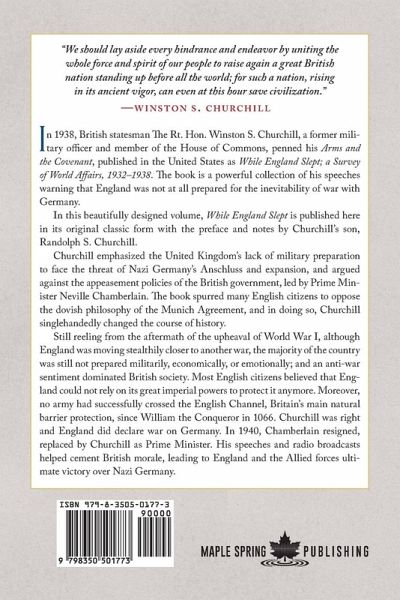 "We should lay aside every hindrance and endeavor by uniting the whole force and spirit of our people to raise again a great British nation standing up before all the world; for such a nation, rising in its ancient vigor, can even at this hour save civilization." - Winston S. Churchill In 1938, British statesman The Rt. Hon. Winston S. Churchill, a former military officer and member of the House of Commons, penned his Arms and the Covenant, published in the United States as While England Slept; a Survey of World Affairs, 1932-1938. The book is a powerful collection of his speeches warning that England was not at all prepared for the inevitability of war with Germany. In this beautifully designed volume, While England Slept is published here in its original classic form with the preface and notes by Churchill's son, Randolph S. Churchill. Churchill emphasized the United Kingdom's lack of military preparation to face the threat of Nazi Germany's Anschluss and expansion, and argued against the appeasement policies of the British government, led by Prime Minister Neville Chamberlain, who said "Peace for our time." The book spurred many English citizens to oppose the dovish philosophy of the Munich Agreement, and in doing so, Churchill singlehandedly changed the course of history. Still reeling from the aftermath of the upheaval of World War I, during the 1930s, although England was moving stealthily closer to another war, the majority of the country was still not prepared militarily, economically, or emotionally; and an anti-war sentiment dominated British society. Most English citizens believed that England could not rely on its great imperial powers to protect it anymore. Moreover, no army had successfully crossed the English Channel, Britain's main natural barrier protection, since William the Conqueror in 1066. Churchill was right and England did declare war on Germany. In 1940, Chamberlain resigned, replaced by Churchill as Prime Minister. His speeches and radio broadcasts helped cement British morale, leading to England and the Allied forces ultimate victory over Nazi Germany. "There is no greater mistake than to suppose that platitudes, smooth words, timid policies, offer today a path to safety. Only by a firm adherence to righteous principles sustained by all the necessary "instrumentalities," to use a famous American expression, can the dangers which close in so steadily upon us and upon the peace of Europe be warded off and overcome. That they can be overcome must be our hope and our faith."- Winston S. Churchill