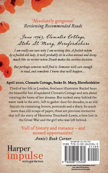 'A lovely, romantic and historical read' - Linda's Book Bag June 1963, Clematis Cottage, Stoke St. Mary, Herefordshire I am really not sure why I am writing this. A foolish whim by a foolish old lady and it will probably sit in a box unread and decay much like its writer when Death makes his careless decision. But perhaps someone will find it. Someone will care enough to read and somehow I know that will happen. April 2000, Clematis Cottage, Stoke St. Mary, Hereford Tired of her life in London, freelance illustrator Rachel buys the beautiful but dilapidated Clematis Cottage and sets about creating the home of her dreams. But tucked away behind the water tank in the attic and left to gather dust for decades is an old biscuit tin containing letters, postcards and a diary. So much more than old scraps of paper, these are precious memories that tell the story of Henrietta Trenchard-Lewis, the love she lost in the Great War and the girl who was left behind.