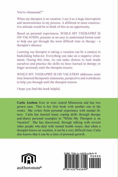 You're whaaaaaat?" When my therapist is on vacation, I see it as a huge interruption and inconvenience in my process. A different or more constructive attitude would be to think of this as an opportunity. Based on personal experiences, WHILE MY THERAPIST IS ON VACATION, presents an easy to understand format. You will find tools to help you get through the most difficult time in therapy - a therapist's absence. Learning our therapist is taking a vacation can be a catalyst to backsliding behavior. Everything can take on a negative orientation. During this time, we can make choices to look inside ourselves and practice the skills we have learned in therapy or linger anxiously until the therapist returns. WHILE MY THERAPIST IS ON VACATION addresses some time honored therapeutic statements, perspective and worksheets to help you through until the therapist returns. I hope you find this book helpful.