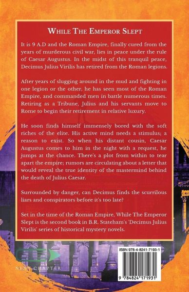 It is 9 A.D and the Roman Empire, finally cured from the years of murderous civil war, lies in peace under the rule of Caesar Augustus. In the midst of this tranquil peace, Decimus Julius Virilis has retired from the Roman legions. After years of slugging around in the mud and fighting in one legion or the other, he has seen most of the Roman Empire, and commanded men in battle numerous times. Retiring as a Tribune, Julius and his servants move to Rome to begin their retirement in relative luxury. He soon finds himself immensely bored with the soft riches of the elite. His active mind needs a stimulus; a reason to exist. So when his distant cousin, Caesar Augustus comes to him in the night with a request, he jumps at the chance. There's a plot from within to tear apart the empire; rumors are circulating about a letter that would reveal the true identity of the mastermind behind the death of Julius Caesar. Surrounded by danger, can Decimus finds the scurrilous liars and conspirators before it's too late? Set in the time of the Roman Empire, While The Emperor Slept is the second book in B.R. Stateham's 'Decimus Julius Virilis' series of historical mystery novels.