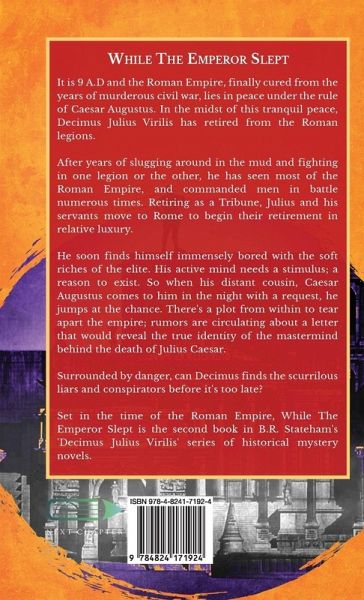 It is 9 A.D and the Roman Empire, finally cured from the years of murderous civil war, lies in peace under the rule of Caesar Augustus. In the midst of this tranquil peace, Decimus Julius Virilis has retired from the Roman legions. After years of slugging around in the mud and fighting in one legion or the other, he has seen most of the Roman Empire, and commanded men in battle numerous times. Retiring as a Tribune, Julius and his servants move to Rome to begin their retirement in relative luxury. He soon finds himself immensely bored with the soft riches of the elite. His active mind needs a stimulus; a reason to exist. So when his distant cousin, Caesar Augustus comes to him in the night with a request, he jumps at the chance. There's a plot from within to tear apart the empire; rumors are circulating about a letter that would reveal the true identity of the mastermind behind the death of Julius Caesar. Surrounded by danger, can Decimus finds the scurrilous liars and conspirators before it's too late? Set in the time of the Roman Empire, While The Emperor Slept is the second book in B.R. Stateham's 'Decimus Julius Virilis' series of historical mystery novels.