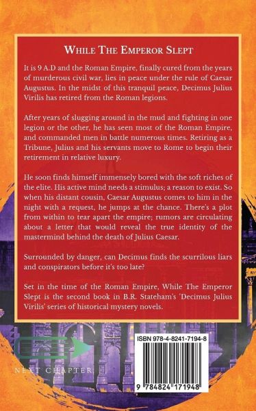 It is 9 A.D and the Roman Empire, finally cured from the years of murderous civil war, lies in peace under the rule of Caesar Augustus. In the midst of this tranquil peace, Decimus Julius Virilis has retired from the Roman legions. After years of slugging around in the mud and fighting in one legion or the other, he has seen most of the Roman Empire, and commanded men in battle numerous times. Retiring as a Tribune, Julius and his servants move to Rome to begin their retirement in relative luxury. He soon finds himself immensely bored with the soft riches of the elite. His active mind needs a stimulus; a reason to exist. So when his distant cousin, Caesar Augustus comes to him in the night with a request, he jumps at the chance. There's a plot from within to tear apart the empire; rumors are circulating about a letter that would reveal the true identity of the mastermind behind the death of Julius Caesar. Surrounded by danger, can Decimus finds the scurrilous liars and conspirators before it's too late? Set in the time of the Roman Empire, While The Emperor Slept is the second book in B.R. Stateham's 'Decimus Julius Virilis' series of historical mystery novels.