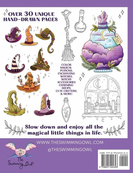Welcome Witchlings!Step into the spellbinding world of Whimsical Witches, a magical coloring book crafted for adults who love all things witchy and wondrous. With over 30 enchanting illustrations by the talented Melanie Bess, this coloring book offers a relaxing and otherworldly experience, perfect for sparking your inner magic. Explore beautifully detailed pages filled with whimsical mandalas, charming portraits, magical animals, and delightful witchy shops like bookshops, bakeries, and herbariums. You'll also discover an assortment of witch brooms, hats, and other mystical items woven throughout these bewitching designs. Whether you're a seasoned artist or just looking for a calming escape, Whimsical Witches is the perfect way to unwind and let your creativity wander the realm of all things witchy. So grab your colored pencils, settle into your coziest spot, and let the magic sweep over you as you bring each witchy page to life! Some of the line art illustrations include:Whimsical Witchy Portraits Witchy Mandalas Pretty Potion Bottles Charming Witchy Shops like a cozy bookshop, bakery, and herbarium Magical brooms, hats, and Witchy Accessories Spooky Insects, Cute Critters, + Witchy Familiars Enchanting Moonlit Scenes ... and so much more! Witchy Coloring Book Details:30+ unique hand-drawn artworks. Page size is a large 8.5 x 11 inches, 'Letter' size, approx. 22 x 28 cm. Images on one side only, framed within the page, no full-bleed images. Paperback Self-Published By the Artist, Melanie Bess, The Swimming Owl