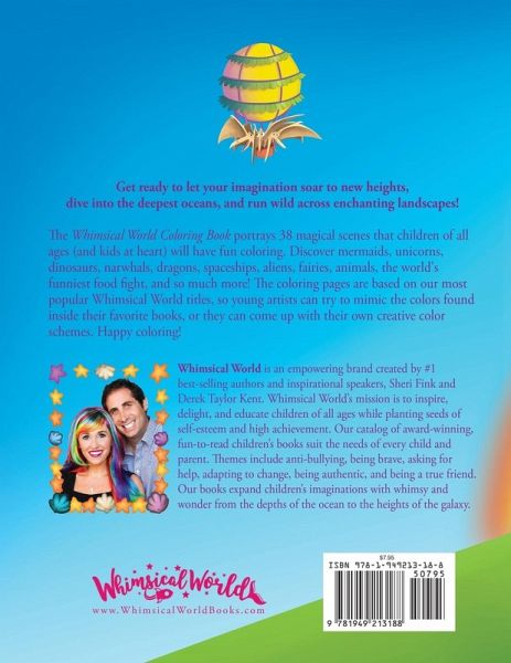 Get ready to let your imagination soar to new heights, dive into the deepest oceans, and run wild across enchanting landscapes! The Whimsical World Coloring Book portrays 38 magical scenes that children of all ages (and kids at heart) will have fun coloring. Discover mermaids, unicorns, dinosaurs, narwhals, dragons, spaceships, aliens, fairies, animals, and world's funniest food fight, and so much more! The coloring pages are based on our most popular Whimsical World titles, so young artists can try to mimic the colors found inside their favorite books, or they can come up with their own creative color schemes. Each page is perforated and easily detaches so your masterpieces can be displayed for all to enjoy. Whimsical World is an empowering brand created by #1 best-selling authors and inspirational speakers, Sheri Fink and Derek Taylor Kent. Whimsical World's mission is to inspire, delight, and educate children of all ages while planting seeds of self-esteem and high achievement. Our catalog of award-winning, fun-to-read children's books suit the needs of every child and parent. Themes include anti-bullying, being brave, asking for help, adapting to change, being authentic, and being a true friend. Our books expand children's imaginations with whimsy and wonder from the depths of the ocean to the heights of the galaxy.