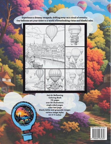 Whimsy in the Wind: Coloring the Skies with Imagination This delightful coloring book invites you to embark on a magical journey into the enchanting world of hot air balloons. Inside its pages, you'll discover over 50 original, charming, and imaginative designs that are guaranteed to ignite your creativity. Each page features a variety of hot air balloons, with its own unique style and theme, from Victorian elegance to floral beauty and playful whimsy. As these balloons gracefully drift over captivating landscapes and scenery, you'll find yourself transported to a world of serene beauty. As an added bonus, the book includes a dedicated back page for color testing, or you can choose to transform it into a unique art piece. Whimsy in the Wind, offers you the choice to color in classic black and white or elegant grayscale, allowing you to tailor your coloring experience. Black and white coloring lets you experiment with a vibrant palette of colors and contrasts, while grayscale coloring allows you to focus on the intricate shading and depth of each image. No matter your coloring style, this book has something to captivate everyone. Simply grab your favorite coloring tools and prepare to float away on a captivating journey through the clouds. Hot Air Ballooning Coloring Book 110 pages over 50 illustrations single sided pages color test page black/white and greyscale images various image styles 8.5 X 11 inches