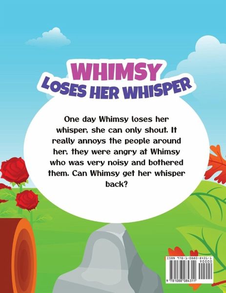 In Whimsy Loses Her Whisper, Whimsy the mouse, runs into trouble when she can only shout everything she says. She finds herself upsetting friends and making people mad. She is confounded about how she could have lost her Whisper, and finds several ways to look for it, all in vain. She seeks help from Dr. Mortimer Mole and Professor Oliver Owl as her friends all help her search mountains, rivers, and caves to try to find her Whisper. It isn't until the librarian, Miss Maybelle takes a walk that everything is resolved. Whimsy suffers highs and lows emotionally but because of the relationships she has forged, she has many people to support her through her troubles.