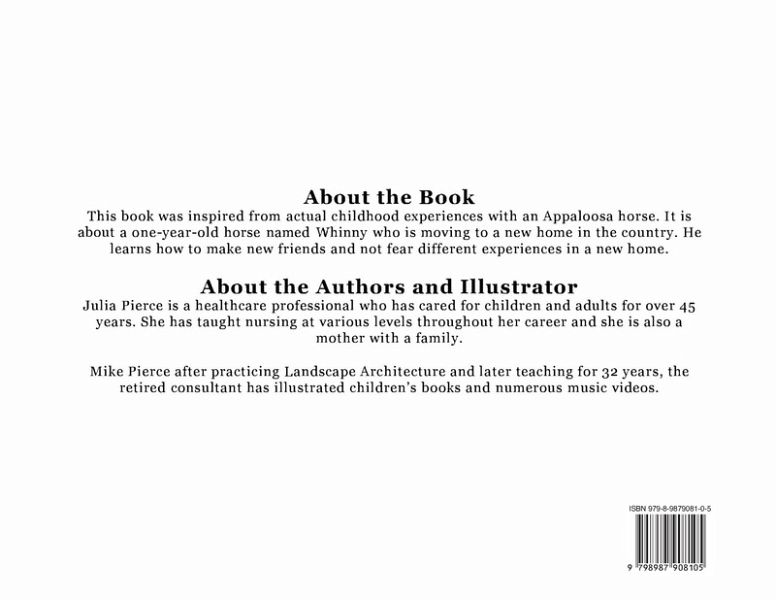 This book was inspired from actual childhood experiences with an Appaloosa horse. It is about a one-year-old horse named Whinny who is moving to a new home in the country. He learns how to make new friends and not fear different experiences in a new home.