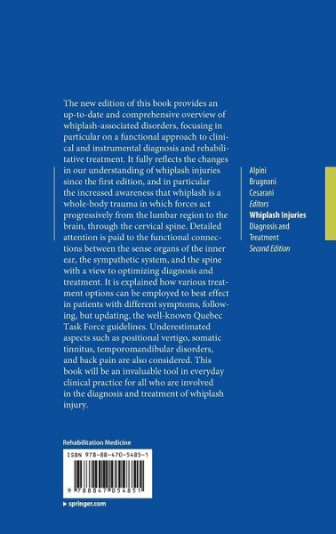 The new edition of this book provides an up-to-date and comprehensive overview of whiplash-associated disorders, focusing in particular on a functional approach to clinical and instrumental diagnosis and rehabilitative treatment. It fully reflects the changes in our understanding of whiplash injuries since the first edition, and in particular the increased awareness that whiplash is a whole-body trauma in which forces act progressively from the lumbar region to the brain, through the cervical spine. Detailed attention is paid to the functional connections between the sense organs of the inner ear, the sympathetic system, and the spine with a view to optimizing diagnosis and treatment. It is explained how various treatment options can be employed to best effect in patients with different symptoms, following, but updating, the well-known Quebec Task Force guidelines. Underestimated aspects such as positional vertigo, somatic tinnitus, temporomandibular disorders, and back pain are also considered. This book will be an invaluable tool in everyday clinical practice for all who are involved in the diagnosis and treatment of whiplash injury.