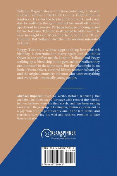 Tellumo Magnamater is a fresh-out-of-college first-year English teacher at Salt Lick County High School in Kentucky. He rides the bus to and from work, and every day he walks to the gym behind his small efficiency apartment to exercise. Perhaps because of being raised by two lesbians, Tellumo is attracted to older men. He sets his sights on fiftysomething bachelor Oliver Crumbly. But Tellumo isn't the only resident interested in Oliver. Peggy Tucker, a widow approaching her sixtieth birthday, is determined to marry again, and she thinks Oliver is her perfect match. Despite Tellumo and Peggy striking up a friendship at the gym, neither realizes they are interested in the same man. But the joke might be on both of them. Oliver, a retired history teacher, is both gay and the original crotchety old man who hates everything and everybody-especially young people.
