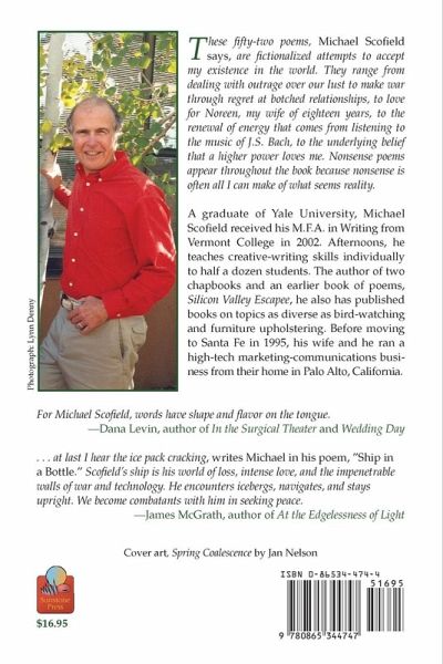 "These fifty-two poems," Michael Scofield says, "are fictionalized attempts to accept my existence in the world. They range from dealing with outrage over our lust to make war through regret at botched relationships, to love for Noreen, my wife of eighteen years, to the renewal of energy that comes from listening to the music of J.S. Bach, to the underlying belief that a higher power loves me. Nonsense poems appear throughout the book because nonsense is often all I can make of what seems reality." A graduate of Yale University, Michael Scofield received his M.F.A. in Writing from Vermont College in 2002. Afternoons, he teaches creative-writing skills individually to half a dozen students. The author of two chapbooks and an earlier book of poems, "Silicon Valley Escapee," he also has published books on topics as diverse as bird-watching and furniture upholstering. Before moving to Santa Fe in 1995, his wife and he ran a high-tech marketing-communications business from their home in Palo Alto, California.