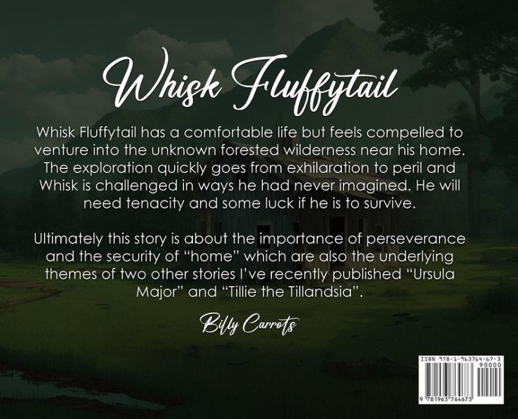 Whisk Fluffytail has a comfortable life but feels compelled to venture into the unknown forested wilderness near his home. The exploration quickly goes from exhilaration to peril and Whisk is challenged in ways he had never imagined. He will need tenacity and some luck if he is to survive. Ultimately this story is about the importance of perseverance and the security of "home" which are also the underlying themes of two other stories I've recently published "Ursula Major" and "Tillie the Tillandsia". Billy Carrots