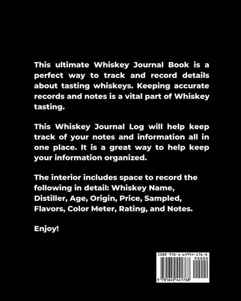 This Whiskey Journal logbook can be a great tool designed for those who love to taste, review & record whiskey products whether it's a dram of Bourbon, Scotch, or Irish Whiskey. Record your whiskey tastings in this unique journal. The interior page contains & features space to write & fill in: Whiskey Name - Write the name of the whiskey. Distiller - Log the name of the distiller. Age - Record the age of the whiskey. Origin - Write where the wine was made. Price - Log the price of the wine. Sampled - Allows you to record where you sampled the wine. Flavors - Check boxes for what does the whiskey taste like Linger, Dark Fruit, Citrus Fruit, Floral, Spicy, Herbal, Woody, Tannic, Char, Sweet, Body, Legs, Malty, Toffee, Balance, Heat/ Proof. Color Meter - Mahogany, Caramel, Amber, Gold, Honey, Straw, Clear. Rating - Allows you to rate from 1-5 stars. Notes - Keep any important information about your whiskey experience you like, specifically which you've tried or idea for ones you want to try, how it affected your palate & nose, factors, etc. It will help you keep track of the whiskey products you review each and every day. Makes a perfect gift idea for any wine connoisseur, friends or family. Whiskey design. Handy to have. Logbook, diary. Easy to use every day. Get one today! Size is 8x10 inch, 110 pages, black ink, white paper, soft matte finish cover, paperback.