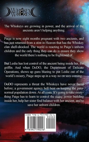 The Whiskeys are growing in power, and the arrival of the ancients aren't helping anything. Paige is now eight months pregnant with two ancients, and has just returned from a stint in Heaven that has the Whiskey clan shell-shocked. The world is reacting to Paige's unborn children and the only thing they can do is ensure they show the world there's nothing to be frightened of. But Leslie has lost control of the ancient being inside her, the griffin. And when DoDO, the Department of Delicate Operations, shows up guns blazing to put Leslie out of the world's misery, Paige steps up in a way no on sees coming. DoDO represents a threat the Whiskeys have never faced before; a government agency hell bent on keeping the paranormal population down. At all costs. It's going to take everything Paige has to learn to control the rising power building inside her, help her sister find balance with her ancient, and to save her unborn children. If you enjoy fast action, strong characters, a tight family unit, and a plot that's hard to guess, this series is for you. Jim Butcher and Kim Harrison fans love it!