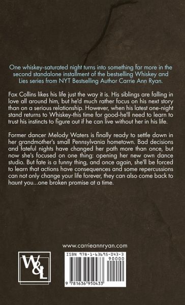 One whiskey-saturated night turns into something far more in the second standalone installment of the bestselling Whiskey and Lies series from NYT Bestselling Author Carrie Ann Ryan. Fox Collins likes his life just the way it is. His siblings are falling in love all around him, but he'd much rather focus on his next story than on a serious relationship. However, when his latest one-night stand returns to Whiskey-this time for good-he'll need to learn to trust his instincts to figure out if he can live without her in his life. Former dancer Melody Waters is finally ready to settle down in her grandmother's small Pennsylvania hometown. Bad decisions and fateful nights have changed her path more than once, but now she's focused on one thing: opening her new own dance studio. But fate is a funny thing, and once again, she'll be forced to learn that actions have consequences and some repercussions can not only change your life forever, they can also come back to haunt you...one broken promise at a time.