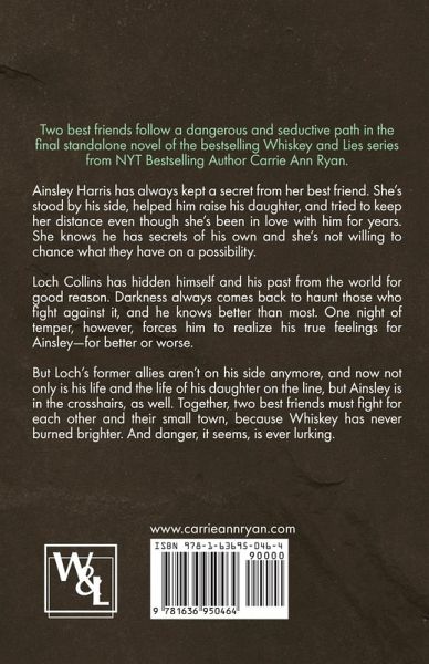 Two best friends follow a dangerous and seductive path in the final standalone novel of the bestselling Whiskey and Lies series from NYT Bestselling Author Carrie Ann Ryan. Ainsley Harris has always kept a secret from her best friend. She's stood by his side, helped him raise his daughter, and tried to keep her distance even though she's been in love with him for years. She knows he has secrets of his own and she's not willing to chance what they have on a possibility. Loch Collins has hidden himself and his past from the world for good reason. Darkness always comes back to haunt those who fight against it, and he knows better than most. One night of temper, however, forces him to realize his true feelings for Ainsley-for better or worse. But Loch's former allies aren't on his side anymore, and now not only is his life and the life of his daughter on the line, but Ainsley is in the crosshairs, as well. Together, two best friends must fight for each other and their small town, because Whiskey has never burned brighter. And danger, it seems, is ever lurking.
