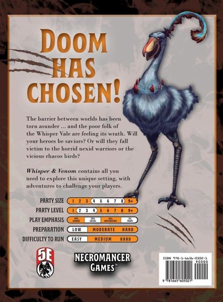 Doom has chosen! The barrier between worlds has been torn asunder ... and the poor folk of the Whisper Vale are feeling its wrath. Will your heroes be saviors? Or will they fall victim to the horrid nexid warriors or the vicious rhacos birds? Whisper & Venom contains all you need to explore this unique setting, with adventures to challenge your players.