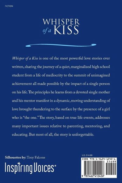 Whisper of a Kiss is one of the most powerful love stories ever written, sharing the journey of a quiet, marginalized high school student from a life of mediocrity to the summit of unimagined achievement all made possible by the impact of a single person on his life. The principles he learns from a devoted single mother and his mentor manifest in a dynamic, moving understanding of love brought thundering to the surface by the presence of a girl who is "the one." The story, based on true life events, addresses many important issues relative to parenting, mentoring, and educating. But most of all, the story is unforgettable.