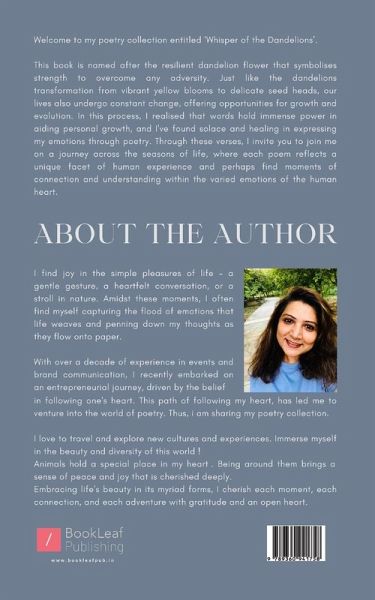 Welcome to my poetry collection entitled 'Whisper of Dandelions'. This book is named after the resilient dandelion flower that symbolises strength to overcome any adversity. Just like the dandelion's transformation from vibrant yellow blooms to delicate seed heads, our lives also undergo constant change, offering opportunities for growth and evolution. In this process, I realised that words hold immense power in aiding personal growth, and I've found solace and healing in expressing my emotions through poetry. Through these verses, I invite you to join me on a journey through the seasons of life, where each poem reflects a unique facet of human experience and perhaps find moments of connection and understanding within the varied emotions of the human heart.