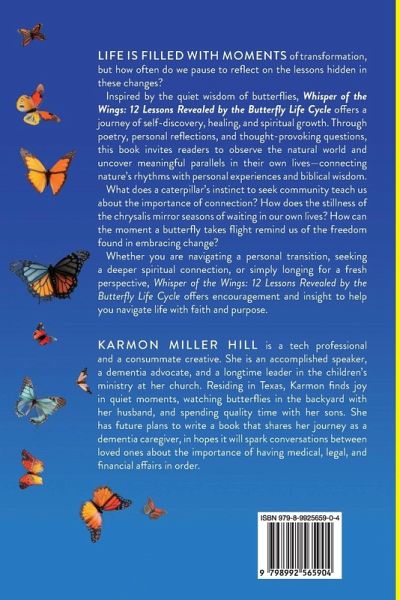 Karmon Hill has long loved the grace and beauty of butterflies. Recalling how monarchs would take to the sky when she was a young girl, she set out to recreate the joy her heart experienced during these times by creating a butterfly haven. Little did she know this would turn into a passion project that would eventually give birth to a book about her butterfly encounters. In addition to being a butterfly enthusiast, Karmon is a tech professional and a consummate creative. She is an accomplished speaker, a dementia advocate, and a longtime leader in the children's ministry at her church. Residing in Texas, Karmon finds joy in quiet moments, watching butterflies in the backyard with her husband, and spending quality time with her sons. She has future plans to write a book that shares her journey as a dementia caregiver, in hopes it will spark conversations between loved ones about the importance of having medical, legal, and financial affairs in order.